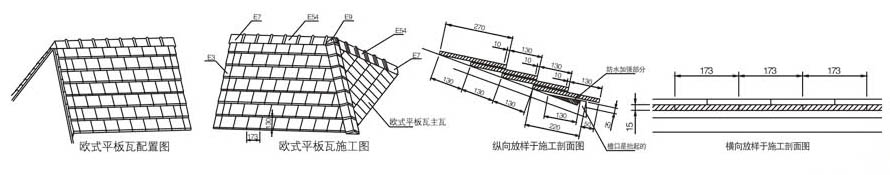 5 盖屋面:由檐口起,沿着纵向墨线一般习惯依序盖1-E7-E54-E7(平板瓦),视情况选用钉钢钉、灰浆垫底或扎线固定。